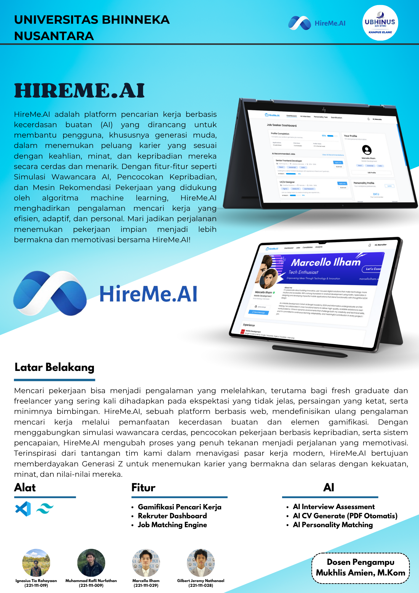 HireMe.AI adalah platform pencari kerja berbasis Artificial Intelligence yang membantu generasi muda menemukan pekerjaan yang sesuai dengan minat, keahlian, dan kepribadian mereka, sekaligus memudahkan perusahaan dalam menemukan kandidat terbaik secara cepat dan efisien.