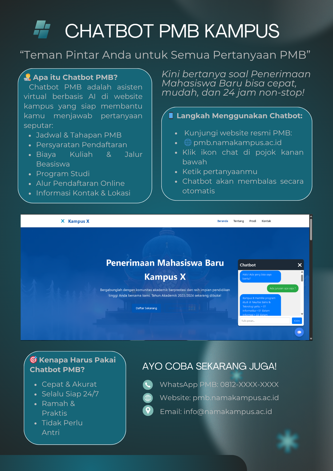 This chatbot is designed to assist the New Student Admissions (PMB) process by providing information automatically and interactively. The system utilizes an Artificial Neural Network (ANN) to understand user questions and the Gemini API to generate more relevant and contextual responses. With this technology integration, the chatbot can quickly and accurately answer questions about registration, schedules, requirements, and other campus information via the PMB website.