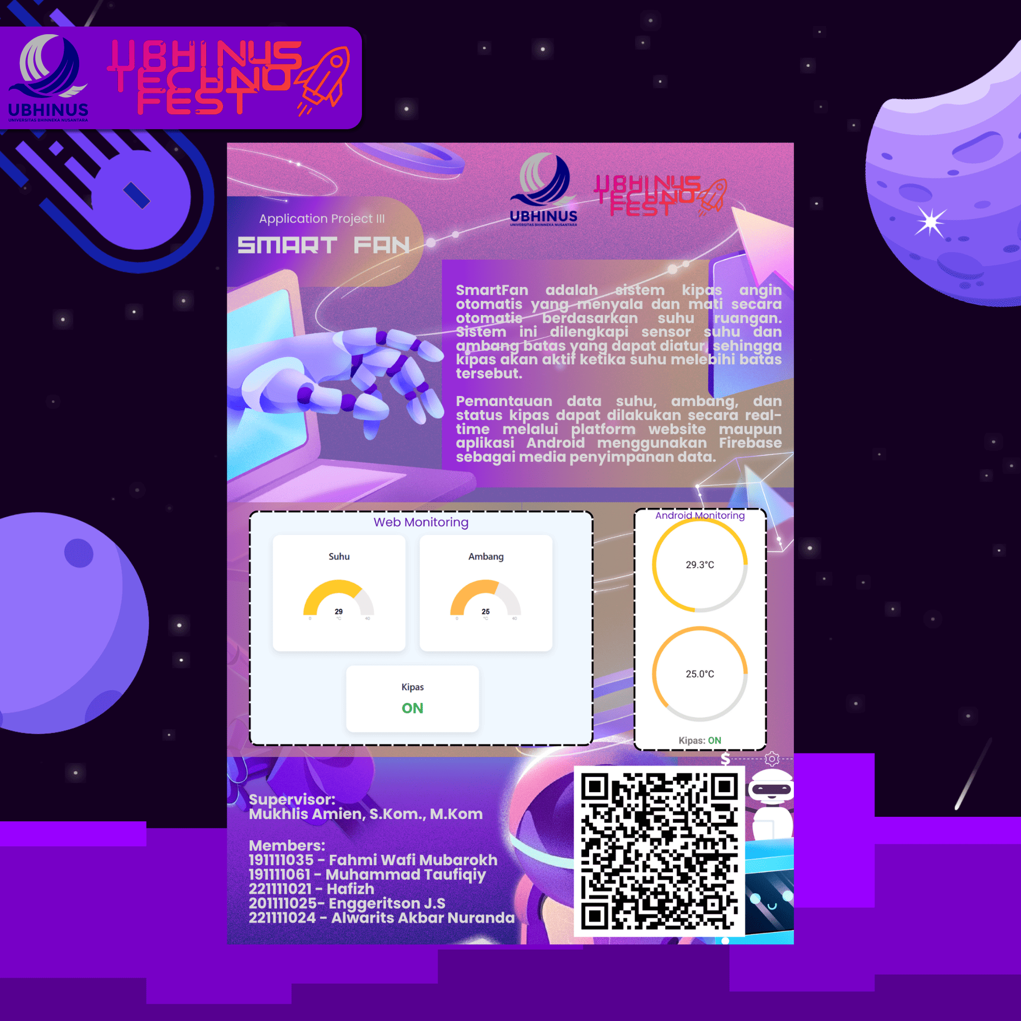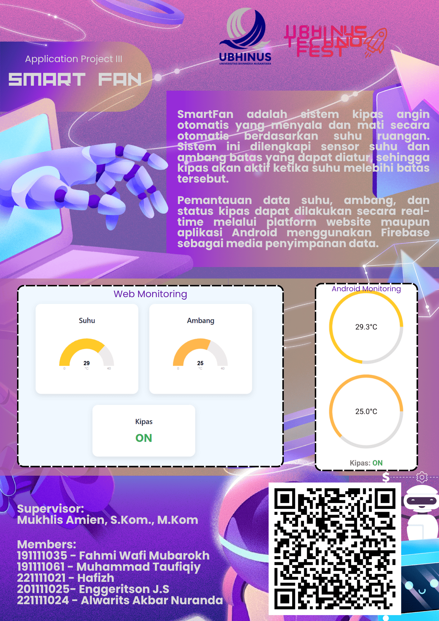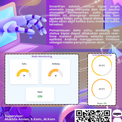 Smart Fan: Automatic Fan with Multiplatform Monitoring via Website and Android is an IoT-based system designed to control and monitor room temperature automatically. The fan turns on or off based on real-time temperature data using a threshold value set by the user. This intelligent system utilizes a DHT sensor to measure room temperature and humidity, with the data sent to Firebase Realtime Database for continuous monitoring.