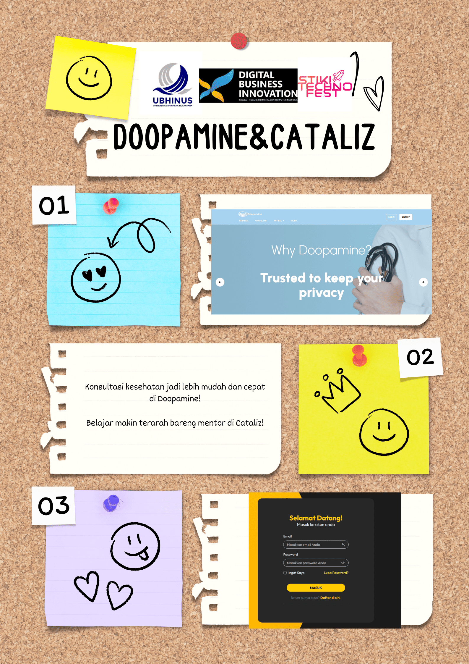 Poster ini memperkenalkan dua platform digital inovatif, Doopamine dan Cataliz, yang berkolaborasi dalam menghadirkan solusi terbaik di bidang kesehatan dan pengembangan diri.