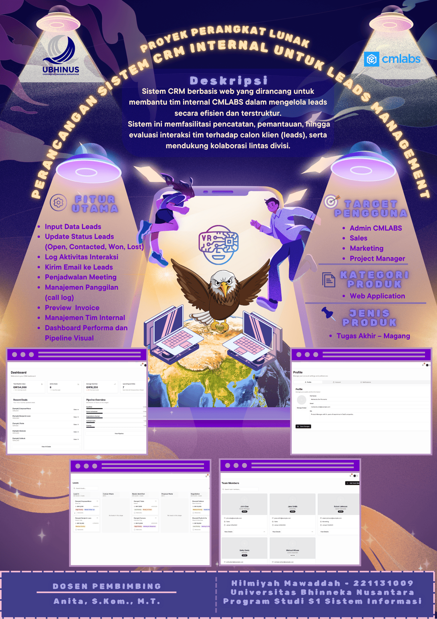 Sistem CRM berbasis web yang dirancang untuk membantu tim internal CMLABS dalam mengelola ledas secara efisien dan terstruktur. Sistem ini memfasilitasi pencatatan, pemantauan, hingga eveluasi internal tim terhadap calam klien (leads), serta mendukung kolaborasi lintas divisi.